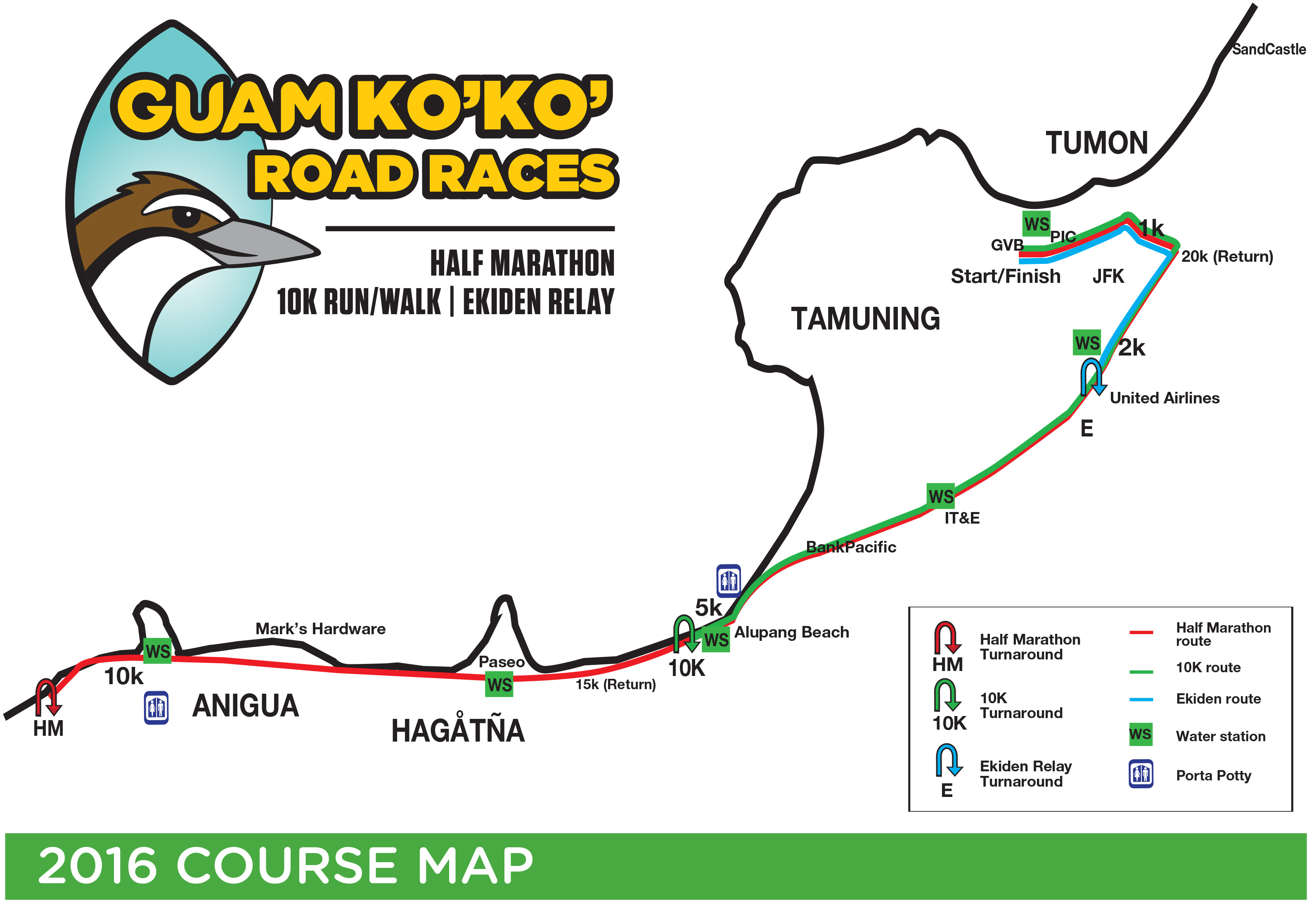 今年是第11屆關島Ko'Ko'馬拉松,所有賽事皆於約瑟夫.佛羅里斯總督海濱公園起跑,沿途經杜夢灣、塔穆寧及首府亞迦納,80%的路線皆沿著關島西部海岸線,參賽者將可飽覽清晨至白日,海天一線的美麗風光。此外,適逢萬聖節前夕,賽事也將與萬聖節主題結合,鼓勵大家以萬聖節主題裝扮參賽,並舉辦造型大賽,為賽事增添趣味性。